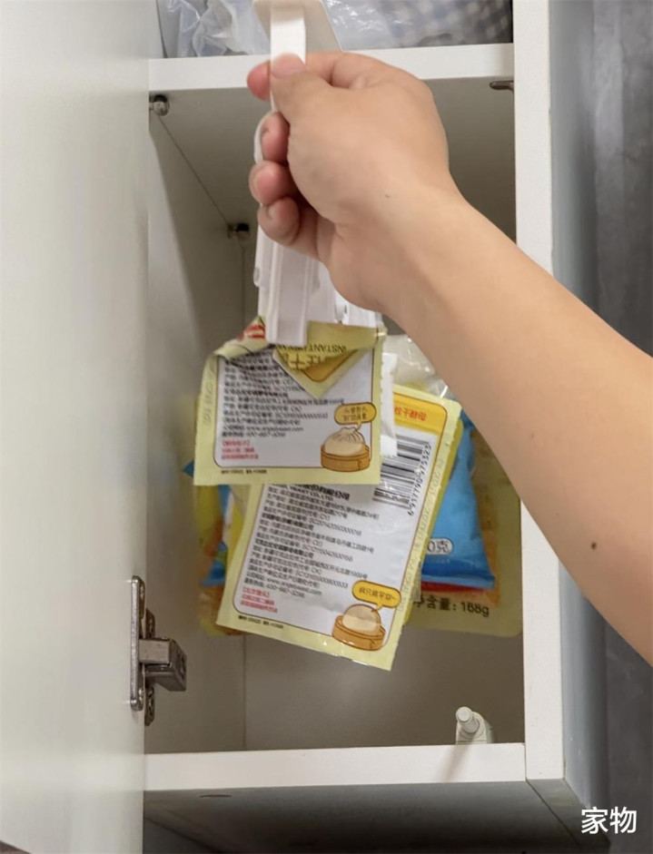 其他还有一些纵向空间收纳,其实也是充分利用起了冗余区域,不怎么占地还实用。 就比如油烟机两侧的吊柜,往往要留出烟道,又窄又深,放点什么都不方便;但自从安装了一个带夹子的吊顶滑轨后,就可以收纳酵母粉、盐糖袋等没用完的调味品,同时起到封口和收纳作用。