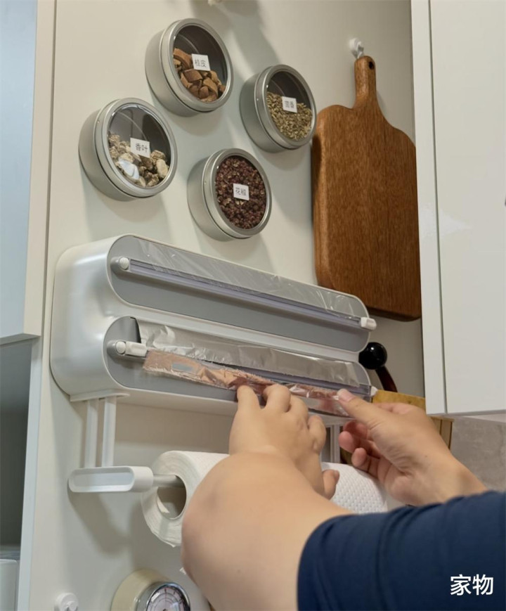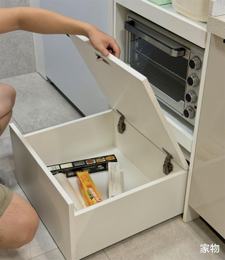 我得着重夸一下这种三层式的保鲜膜+锡纸+厨房纸架,无论是磁吸吸附在这金属板上,还是贴在厨房墙面的其他位置,都超实用,拿的时候顺手一撕,毫不费力,你说这东西是谁研究出来的呢?好用,爱用,以后还要一直用! 【底柜收纳杂物,必要时当垫脚凳】