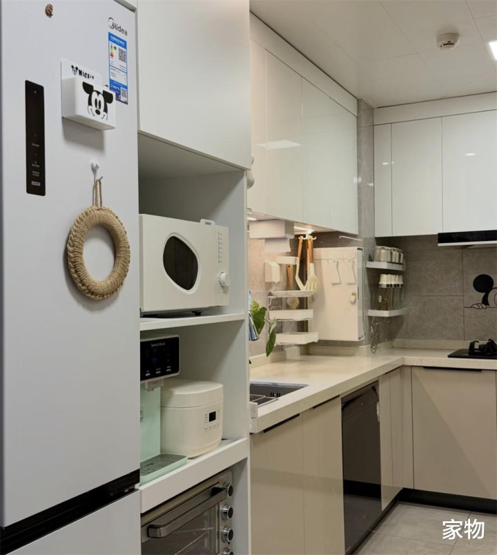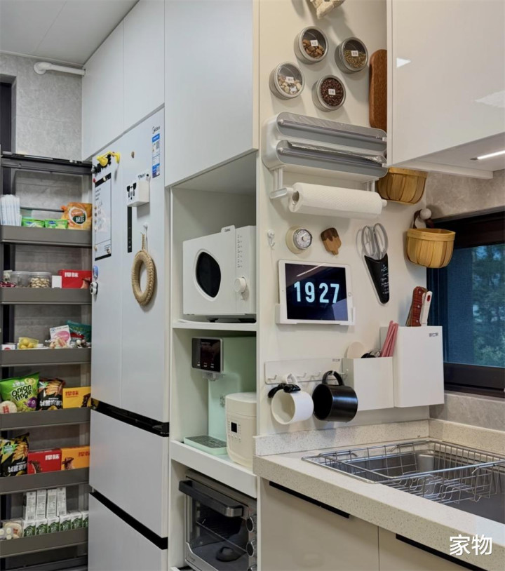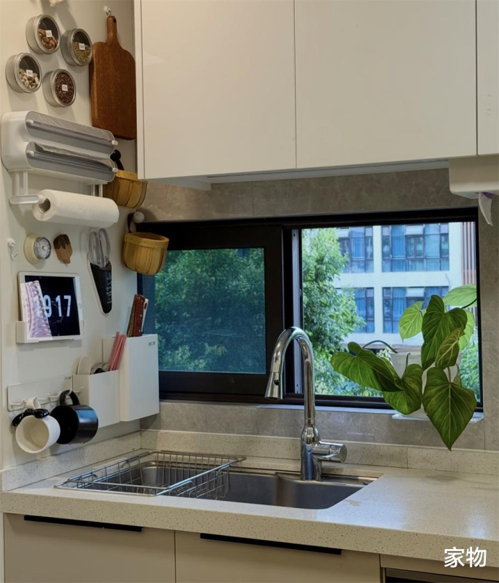 一些调料盒、定时器、剪刀乃至刀架砧板架,都可以吸附在上面,别担心不牢固,现在有好多这种磁扣吸附效果都很不错,甚至有空间冗余,还可以贴点冰箱贴当做装饰,放个PAD做菜时候看菜谱、听歌,都很不错。
