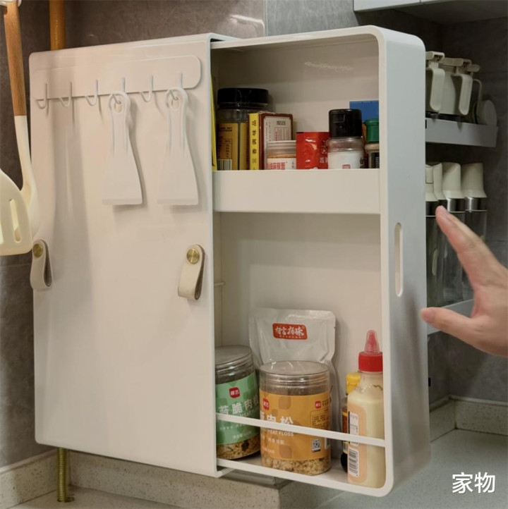 又比如厨房公共烟道外凸的位置,贴上一个收纳盒,上下两层都可以收纳调味品和瓶瓶罐罐,抽拉式打开,也比直接挂在墙上方便拿取(且能防油烟)。 外面再贴挂钩,小小一处空间,可以收纳的餐具厨具不计其数。
