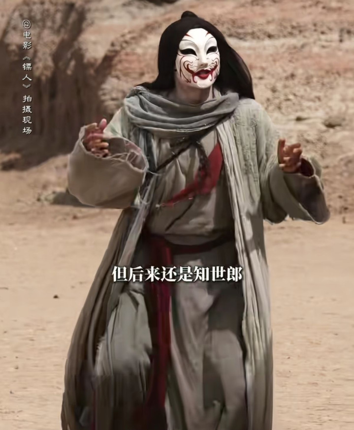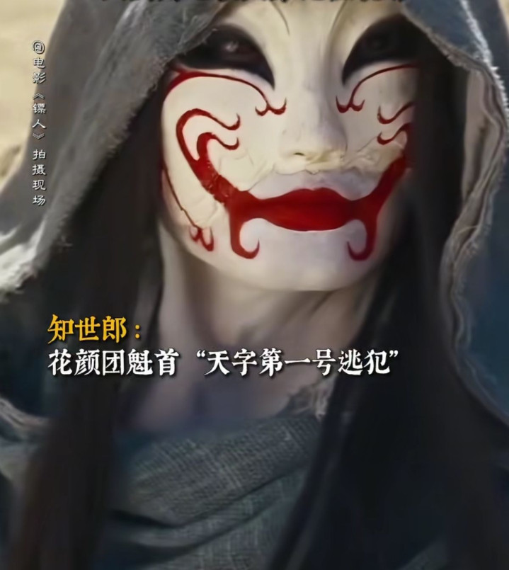 二,熟悉的声音,陌生的背影,他是谁? 《镖人》之所以能称得上全明星阵容,是因为每一个角色的扮演者都来头不小。 比如预告中戴着面具的关键人物知世郎,全片都不会露脸,但扮演者却是孙艺洲。 这一角色的设定是花颜团魁首,天字第一号逃犯,镖客刀马护送的就是他。
