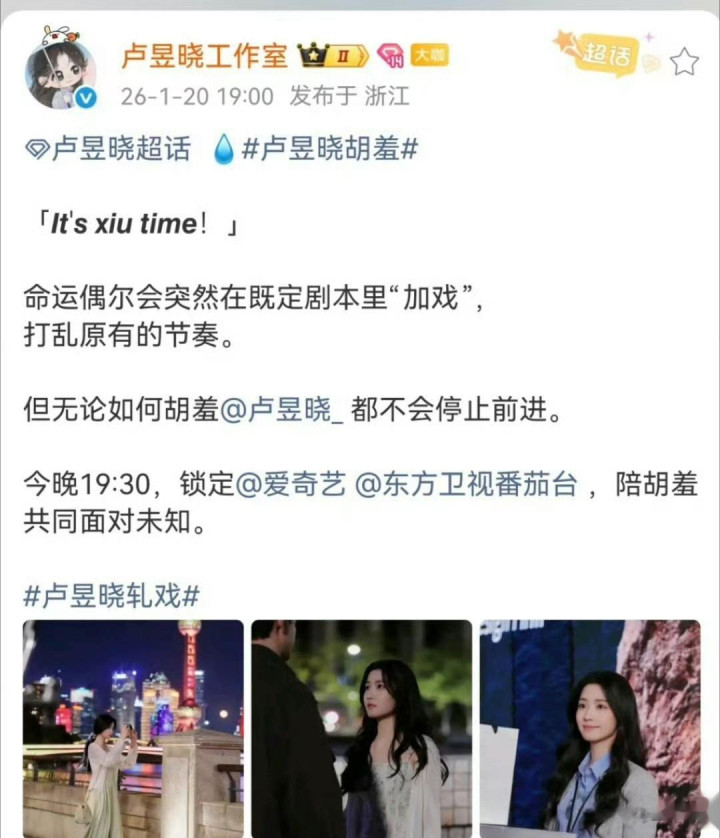 卢昱晓工作室发文疑内涵陈星旭加戏。卢昱晓工作室在2026年1月20日《轧戏》大结局宣传文案中使用"加戏"一词,引发网友猜测是否暗指合作演员陈星旭擅自增加戏份,该话题迅速登上热搜,成为剧集收官当日最热争议焦点。