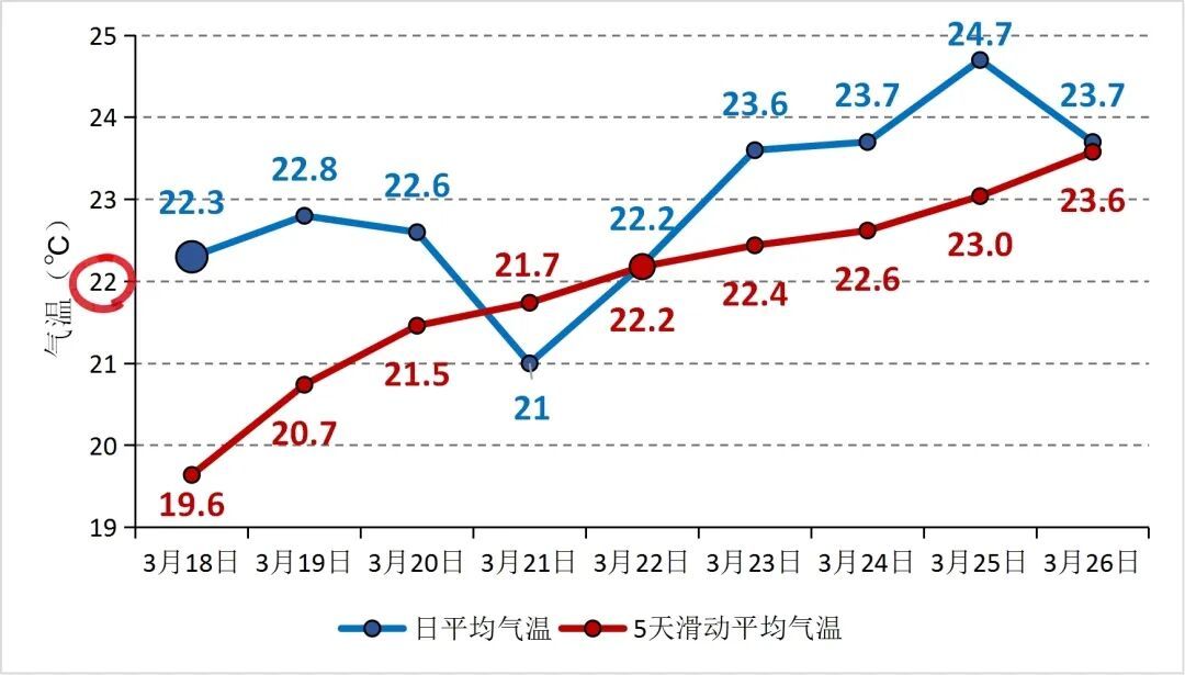 浅陋说 需要聚积5个滑动平均值 都跳跃22℃ 而要算出5个这么的值 最少要累积9天的平均气温 3月18日的日平均气温 诚然跳跃了22℃ 但咱们要等后续数据“凑都”
