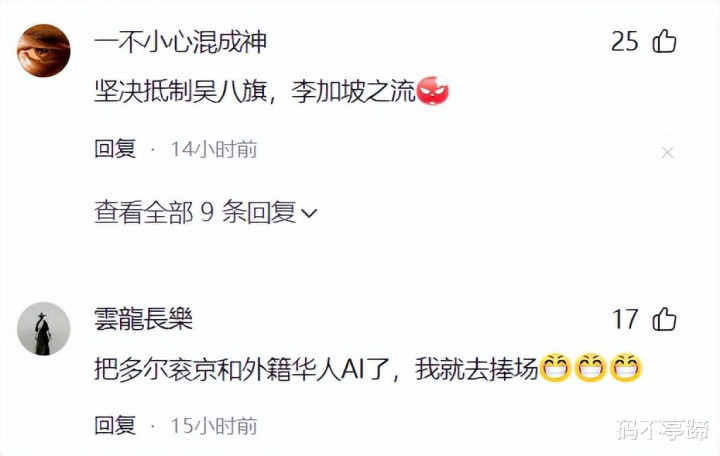 有骂“多尔衮京”的,有说“吴白旗李家坡”的,有讲“让八旗子弟聚会”,有说“不再让满清分子赚我一个铜板”的……太多太多了,总之,就是咬着“吴京是满族人”的身份不放。